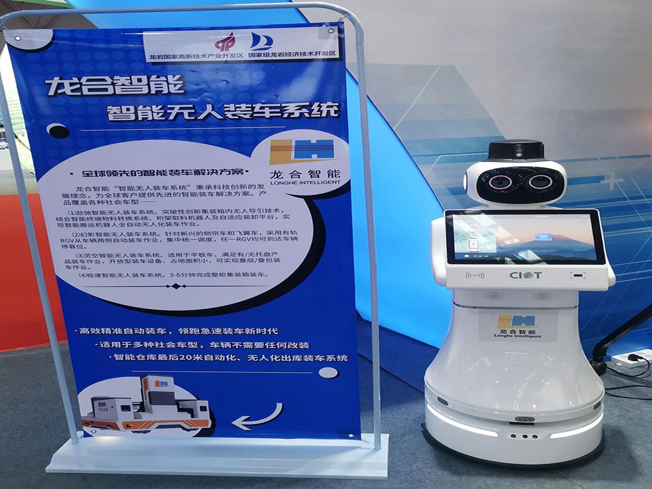 福建省省委常委、常務(wù)副省長郭寧寧、副省長林文斌、龍巖高新區(qū)(經(jīng)開區(qū))黨工委書記、管委會主任袁靜等領(lǐng)導(dǎo)親臨龍合智能展位視察指導(dǎo),公司董事長楊靜向各位領(lǐng)導(dǎo)詳細(xì)匯報了公司智能無人裝卸系統(tǒng)的研發(fā)成果及運(yùn)用情況。