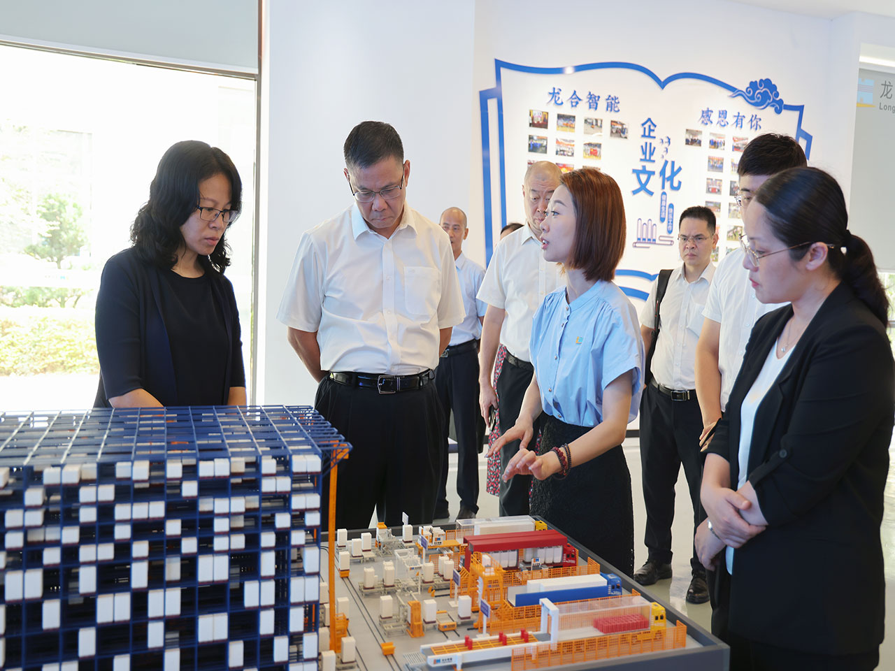 黃躍珍一行參觀了龍合智能數(shù)字化黨建文化展廳,聽(tīng)取楊靜董事長(zhǎng)就公司發(fā)展歷程、生產(chǎn)工藝及自主研發(fā)生產(chǎn)的靈空、幻影、極速、勁馳四大智能無(wú)人裝卸設(shè)備和系統(tǒng)集成產(chǎn)品等方面介紹,詳細(xì)了解我司5G+智慧工廠項(xiàng)目建設(shè)及規(guī)劃布局等情況。