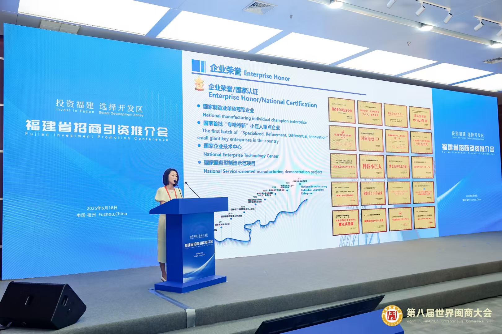 2025年6月18日,以“匯聚閩商力量,同心奮勇爭先”為主題的第八屆世界閩商大會在福州隆重舉行,我司董事長楊靜以福建省招商顧問身份受邀參加本次世界閩商大會,并分享了公司的發(fā)展藍圖。